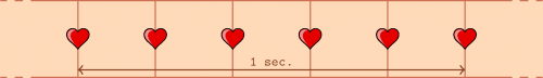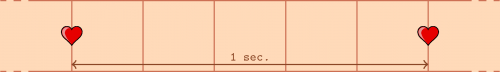 Vedi, gli faccio, su questa striscia di carta c'è disegnato il nostro cuore che batte. Sullo sfondo ci sono disegnati dei grossi quadratoni. Cinque quadratoni equivale ad un secondo. Questo, ad esempio è un cuore che batte una volta al secondo. Vedi? Ogni cinque quadratoni, ossia ogni secondo, c'è un battito del cuore.