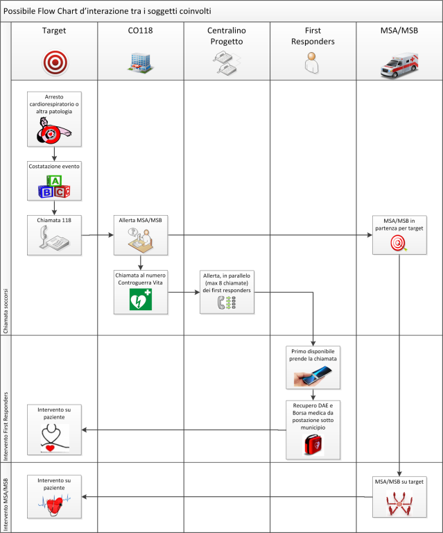 Un possibile flowchart funzionale del sistema a regime è che, a fronte di un evento cardiaco sul territorio comunale, il cittadino allerta la centrale operativa 118 (CO118) di zona che attiva le classiche misure per l’invio, sul target, delle ambulanze. La centrale operativa effettua una chiamata al numero unico del progetto o, in alternativa, viene fatta comunicazione ai cittadini su un ulteriore numero da chiamare in caso di evento cardiaco.
