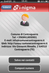 A questo punto è possibile, con un solo click, chiamare il comune, inviare una mail o aprire il sito web del comune, o aprire il navigatore per trovare la strada più veloce per raggiungere il municipio. Questa qui è la versione decodificata da un lettore di QR Code online.